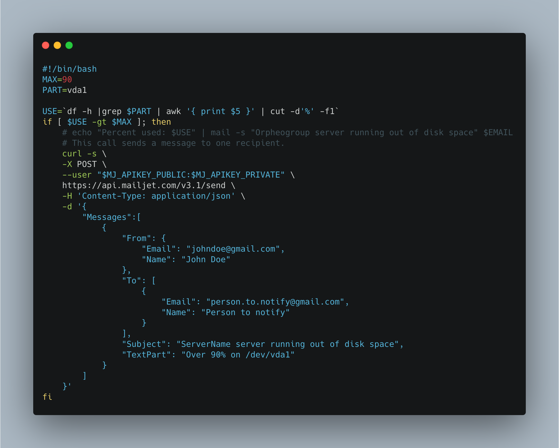 Send email notification through mailjet when disk usage reaches 90 percent